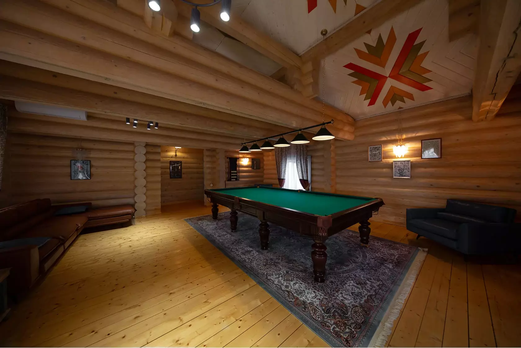 На втором этаже терема — лаунж-зона с мягкой мебелью, где приятно посидеть после парной или фильтра чая. Для активного отдыха доступны бильярд и настольный футбол — отличное дополнение к вечеру в компании.