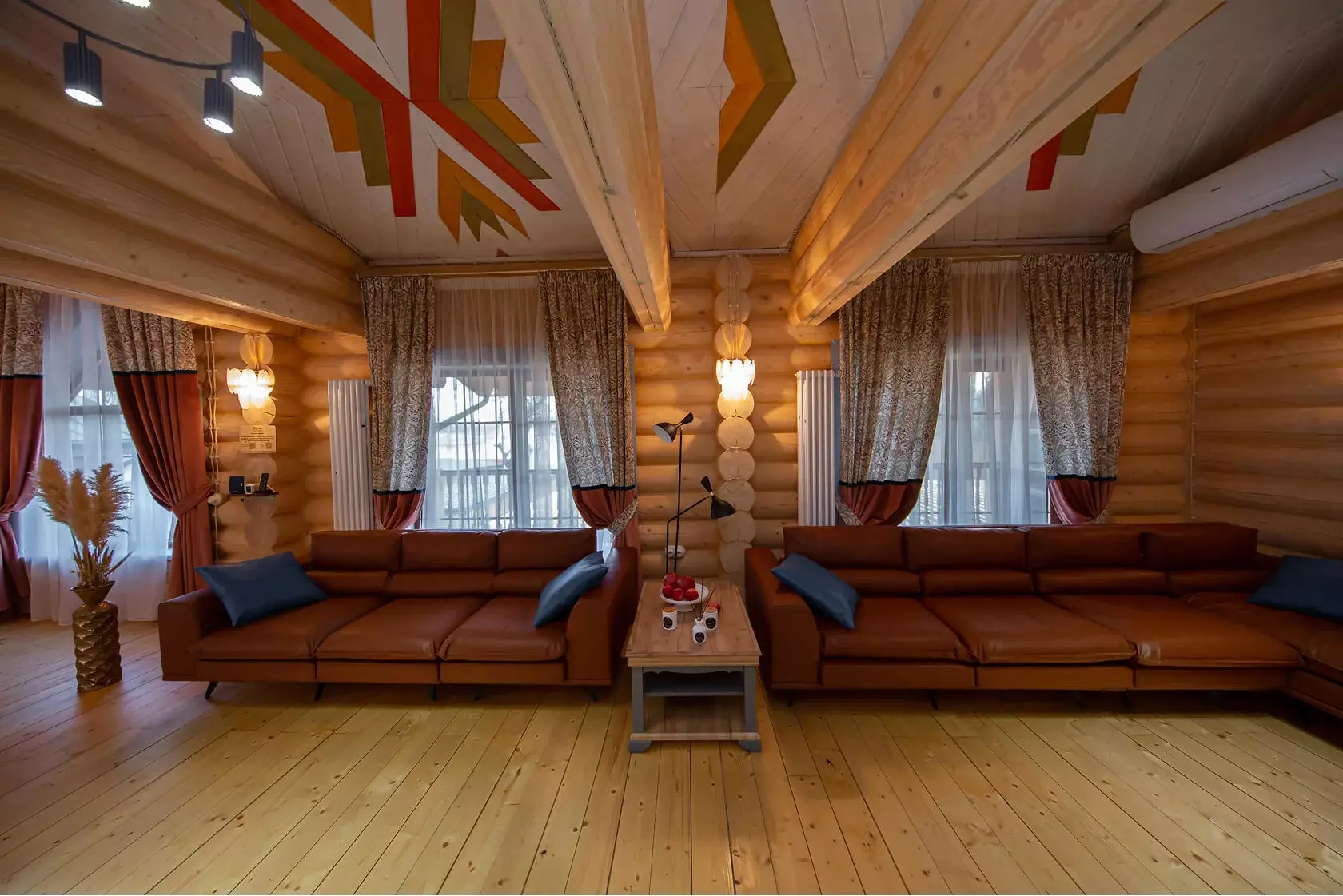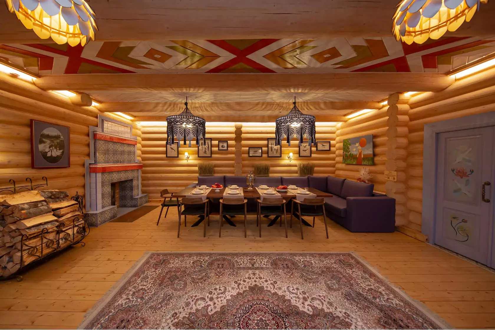 Главное место встреч — просторная гостиная с камином. Тепло огня, аромат дерева и мягкий свет создают атмосферу уюта и спокойствия. Здесь можно отметить праздник, устроить семейный ужин или просто собраться с друзьями за большим столом.
