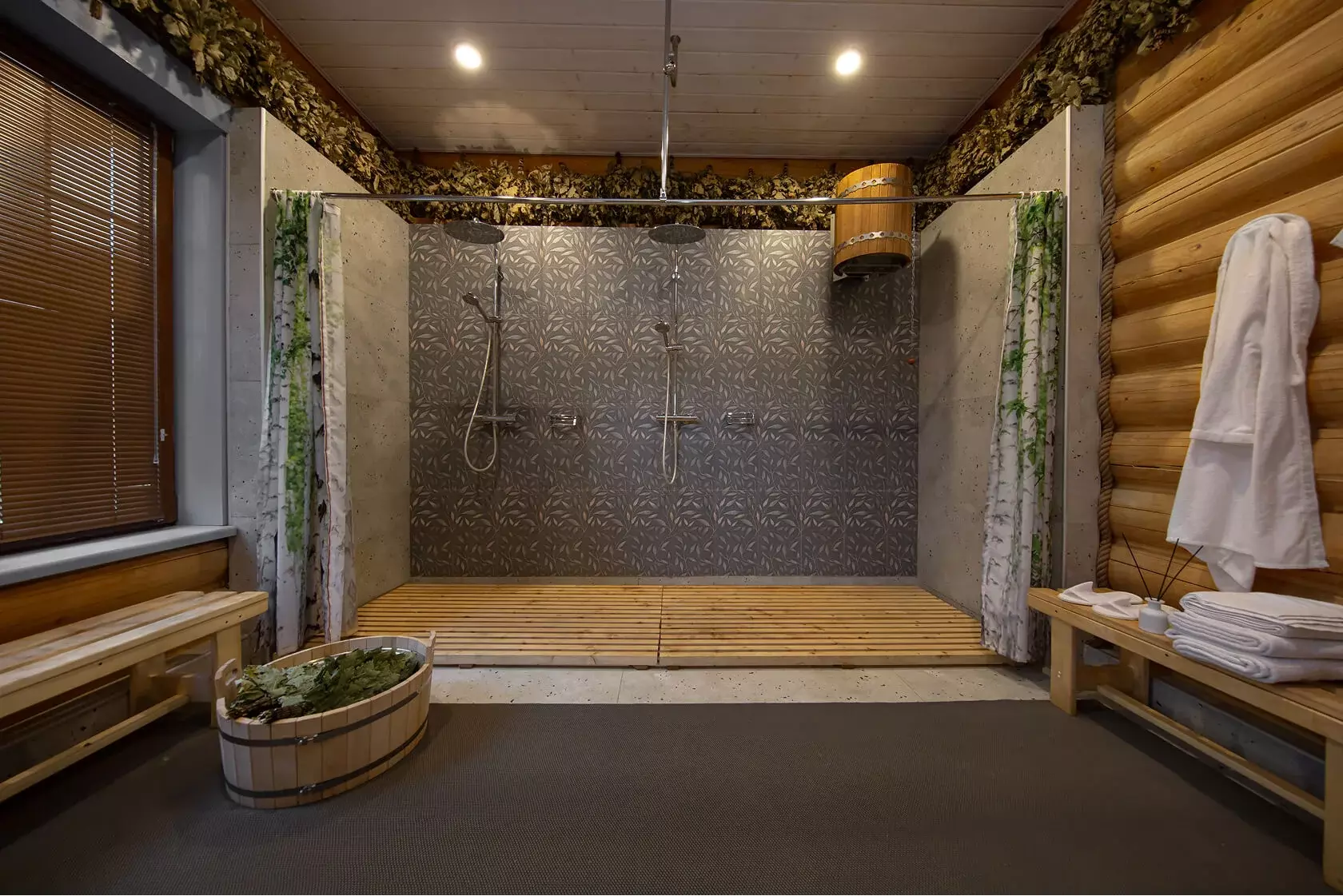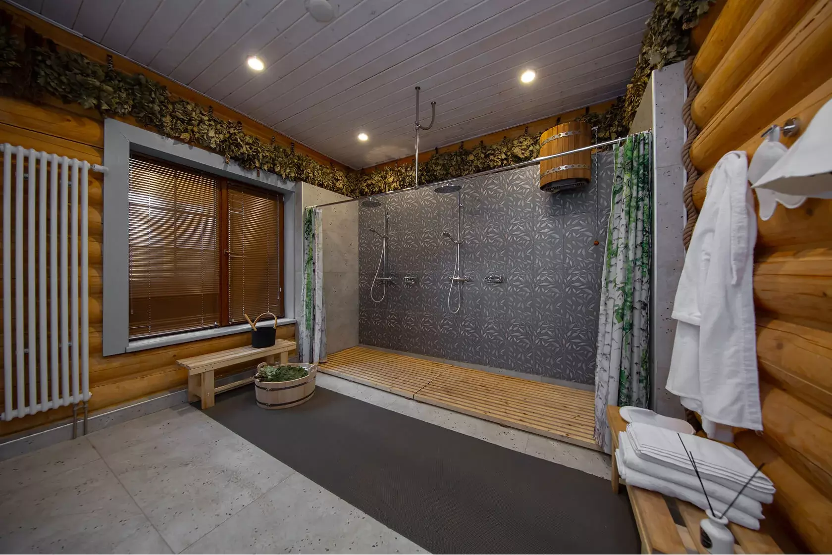 Всё продумано для комфортных процедур: ♦ парение с берёзовыми и можжевеловыми вениками; ♦ охлаждение снегом и льдом прямо в парной; ♦ тропический душ и обливное ведро «водопад» для контраста.