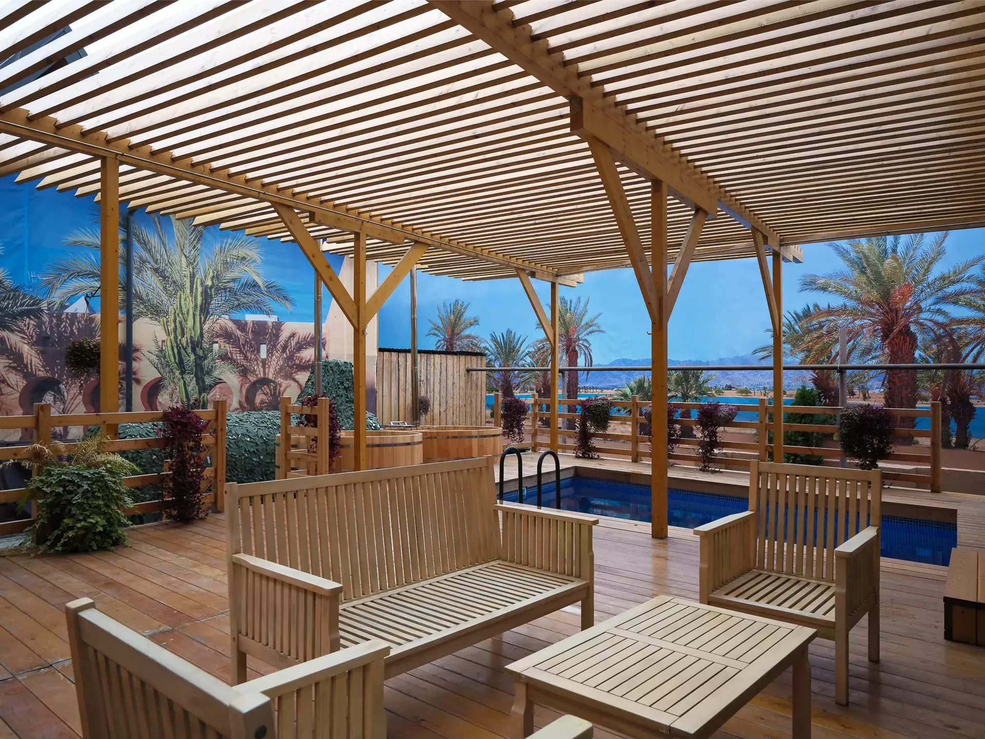 Рядом — веранда и лаунж-зона, где можно отдохнуть в халате, насладиться горячим чаем с имбирём или освежающим напитком. Тихий вечер, мерцающий свет и пар из купели создают атмосферу настоящего уюта.