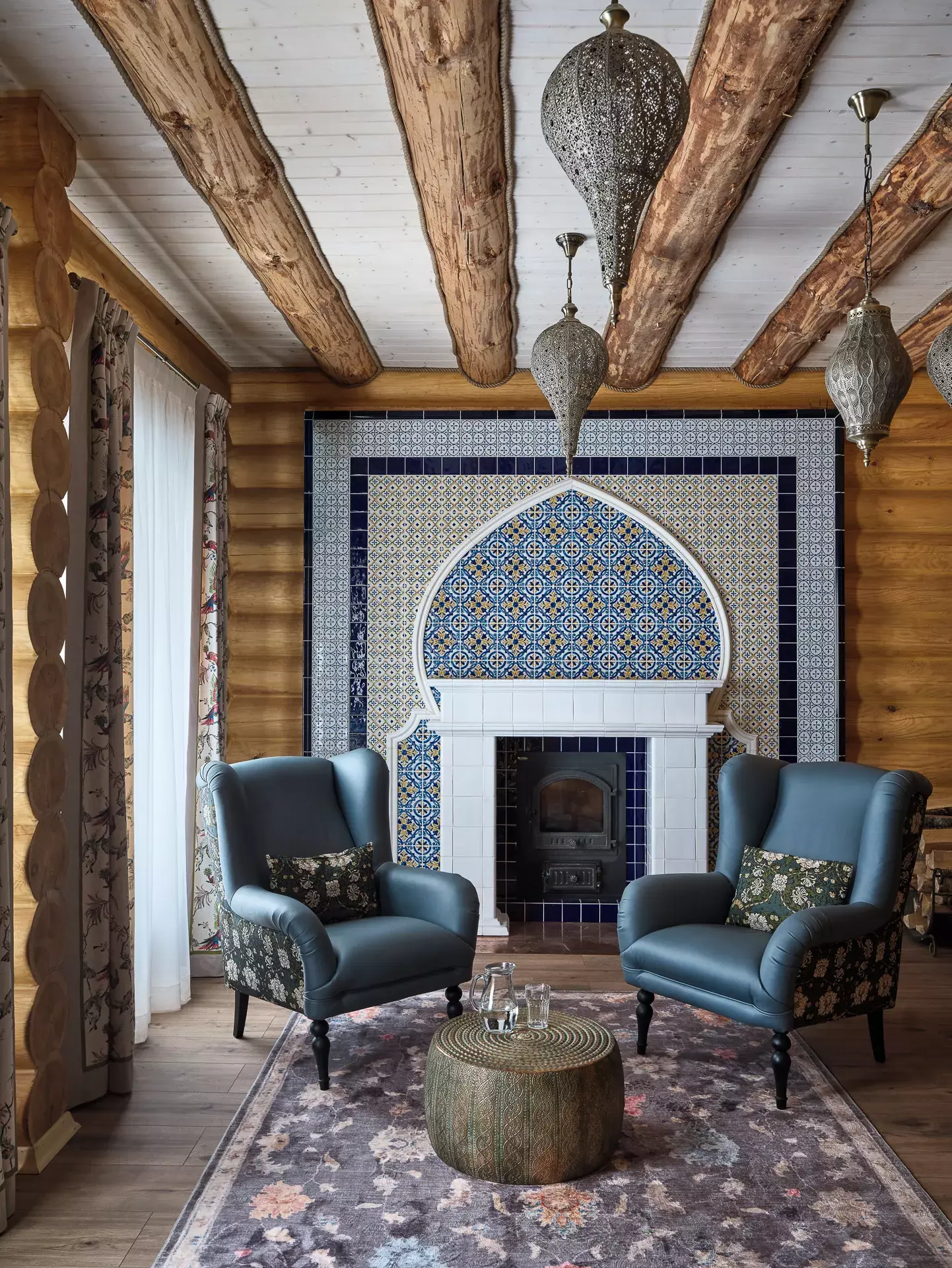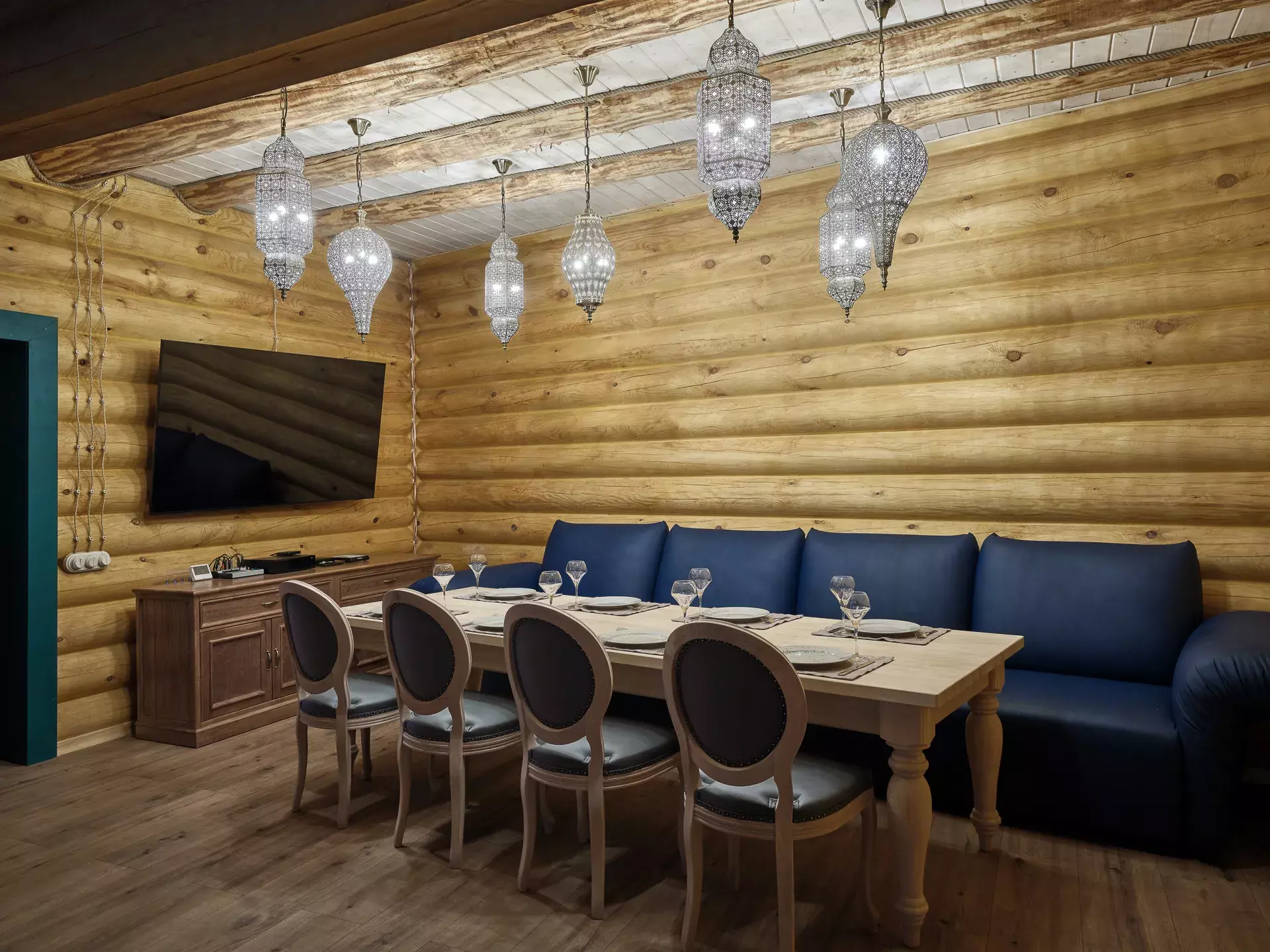 Главная часть терема — гостиная с большим столом и камином, где можно провести вечер с близкими или отметить праздник в уютной атмосфере. Мягкий свет и спокойные тона интерьера наполняют пространство ощущением уюта, а треск дров добавляет особого очарования.