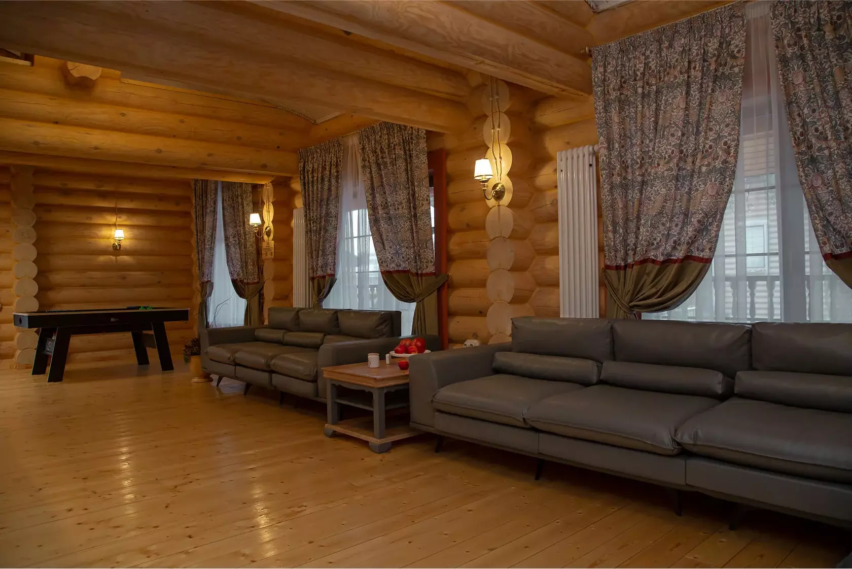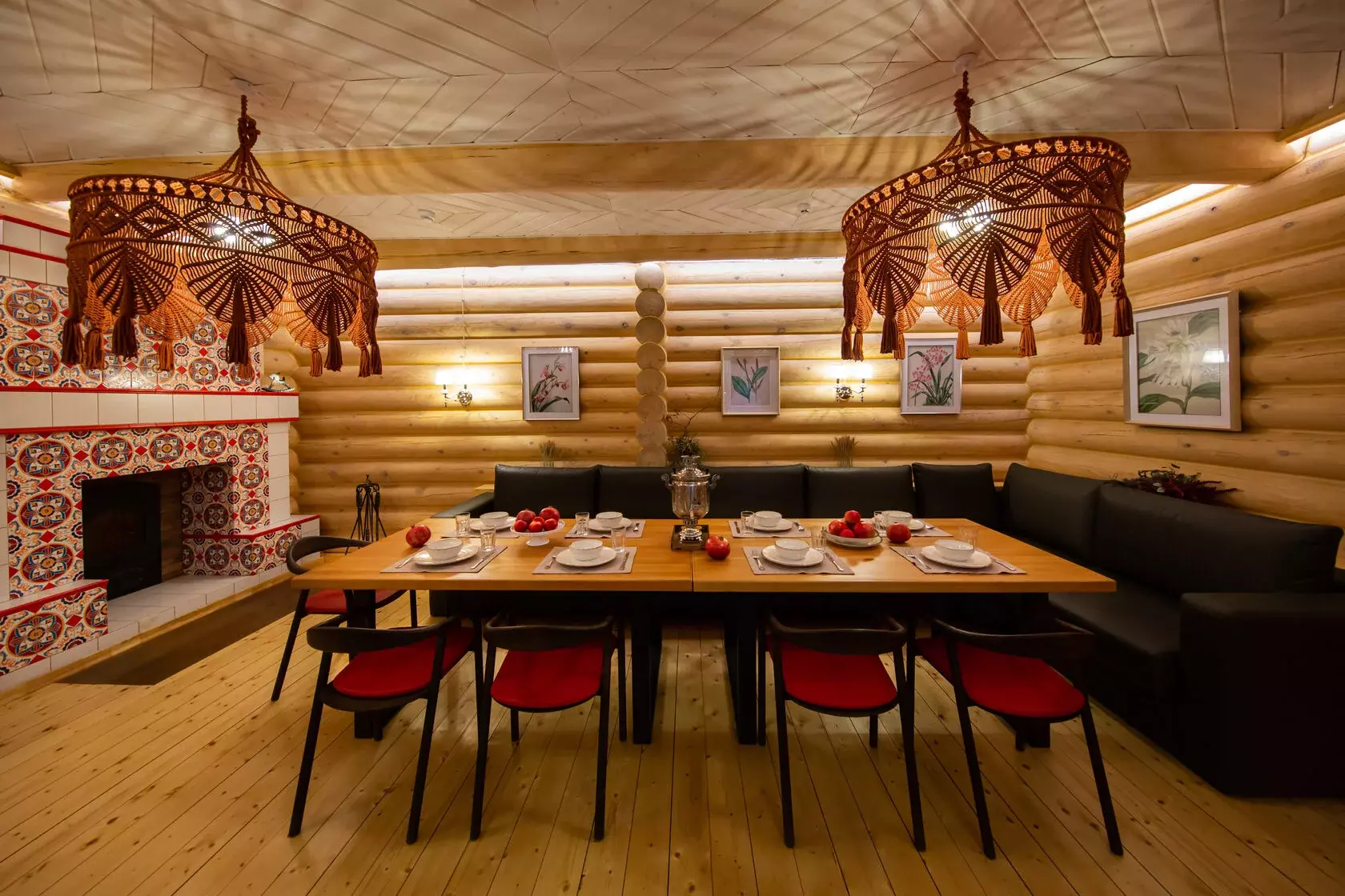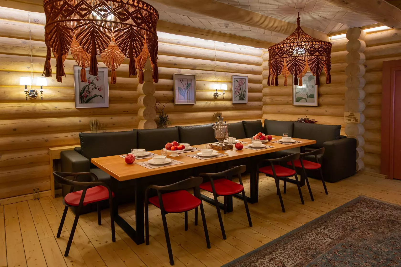 Главная гостиная терема — центр весёлых встреч. Большой стол, мягкие диваны и живой огонь камина создают атмосферу тепла и праздника. Здесь можно отметить день рождения, устроить вечер с друзьями или просто собраться за душевной беседой.